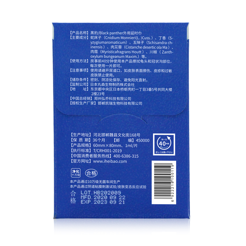 黑豹男用延時(shí)濕巾的使用用量為每次一片,先清洗干凈身體以及下身,等待進(jìn)行房事前半小時(shí)取出濕巾打開慢慢來回擦拭龜頭以及冠狀溝處10-20分鐘,等到龜頭處有熱感身體有感覺后2-5分鐘便可進(jìn)行房事。能夠有效的延長(zhǎng)10-30分鐘的房事時(shí)間,起到幫助增加夫妻感情生活的效果。