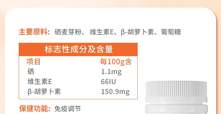 • 主要成分 硒麥芽粉,維生素E,β-胡蘿卜素,葡萄糖