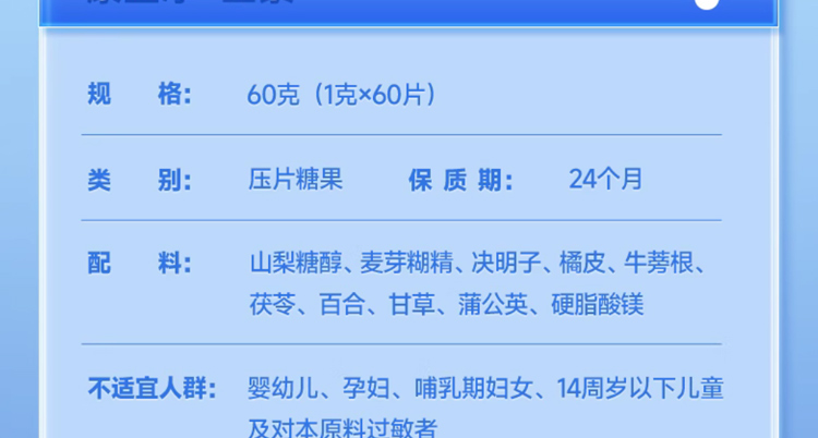 • 注意事項(xiàng) 本產(chǎn)品為膳食補(bǔ)充劑,不能代替藥物,不宜超過推薦量或與同類營養(yǎng)補(bǔ)充劑同時食用