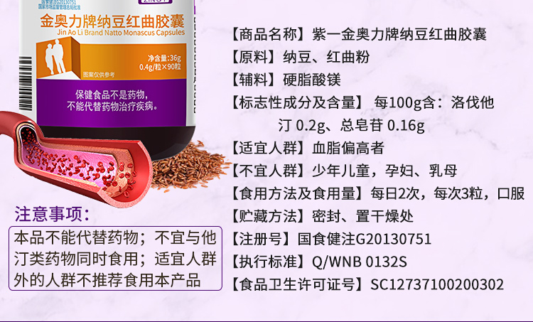 納豆紅曲膠囊屬于保健品,而非藥品,以楚閣坊金奧力牌納豆紅曲膠囊為例,本品含有豐富的紅曲、納豆等有效成分,相互作用可以起到凈化血管和調(diào)節(jié)血脂的的功效與作用,可以幫助清理血管中的垃圾與雜質(zhì),還可以幫助軟化血管、促進血液循環(huán),能夠有效緩解高血脂所引起的頭暈頭痛、四肢麻木、精力不濟等多種亞健康問題,適合三高人群以及高脂飲食的人群服用。