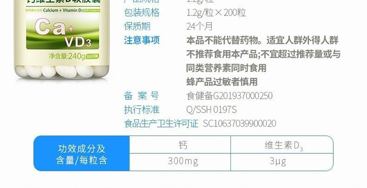• 含量 每粒含:鈣 300mg、維生素D 3μg