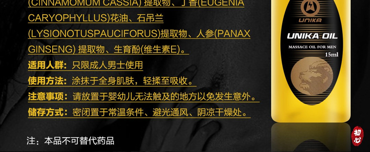 皇帝油需要嚴(yán)格按照正確的方法來進(jìn)行使用。如果有需要的話,可以每天都堅(jiān)持使用,一般堅(jiān)持使用4瓶為一個(gè)周期?;实塾椭饕煞萦心仙咛?、丁香、肉豆蔻、肉桂、甘松、介子油等,能夠溫和不刺激的快速滲透,可以有助于幫助男性朋友改善性能力,對(duì)改善陽痿早泄和陰莖短小均有良好的效果。這個(gè)產(chǎn)品可以通過局部的刺激,讓陰莖的血液循環(huán)變得更好,可以擴(kuò)張血管,也可以加速細(xì)胞的運(yùn)動(dòng),另外也有助于性功能的改善,對(duì)改善陽痿早泄也有良好功效。