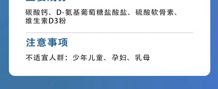 臻培因安骨素的主要作用是增強(qiáng)骨密度、改善關(guān)節(jié)健康。這款產(chǎn)品含有碳酸鈣、D-氨基葡萄糖鹽酸鹽、硫酸軟骨素鈉以及維生素D3粉等成分,其中,鈣可以增強(qiáng)骨密度,維持骨骼正常發(fā)育,預(yù)防骨質(zhì)疏松,維生素D3可以增強(qiáng)補(bǔ)鈣的效果,D-氨基葡萄糖鹽酸鹽、硫酸軟骨素鈉則可以促進(jìn)軟骨修復(fù),潤滑關(guān)節(jié),這些成分協(xié)同作用,可以維持骨骼、關(guān)節(jié)健康,緩解因骨關(guān)節(jié)炎、軟骨磨損等引起的關(guān)節(jié)疼痛、僵硬、腫脹等癥狀,該產(chǎn)品每天服用2次,每次2粒即可,但孕婦、乳母、嬰幼兒等人群不能使用。