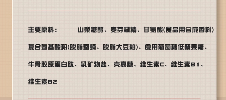 • 主要成分 甘氨酸、復(fù)合氨基酸粉、牛骨膠原蛋白肽、乳礦物鹽、殼聚糖、維生素C等