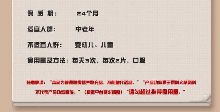 • 注意事項(xiàng) 本產(chǎn)品為膳食補(bǔ)充劑,不能代替藥物,不宜超過(guò)推薦量或與同類(lèi)營(yíng)養(yǎng)補(bǔ)充劑同時(shí)食用
