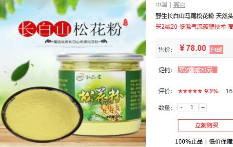比如這款泓品堂松花粉,100g/罐售價是78元,相比國珍牌要實惠很多,且紫一商城活動,買2立減20元,據(jù)1617位客戶反饋品質(zhì)好,吸收高,且價格實惠,點擊查看客戶評價及產(chǎn)品詳情~